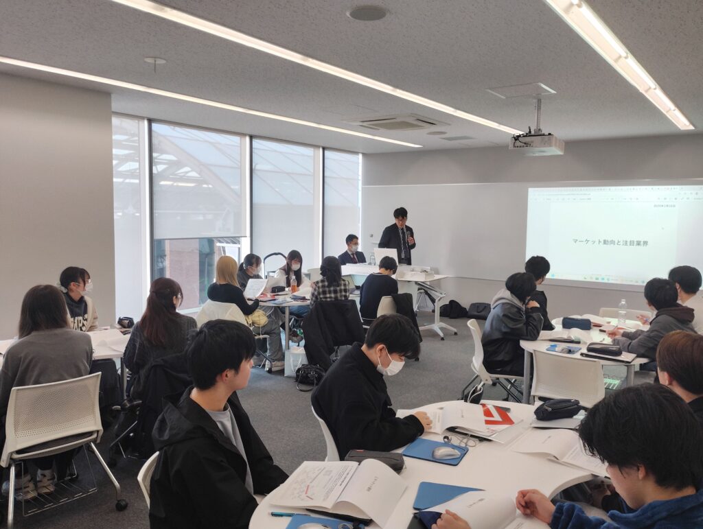 2026.01.19 イベント 卒業生 学生 教育 岡地証券様によるミニ講演会 岡地証券様から、馬渡様(本学卒業生)、坂様(証券アナリスト)が来学され、野口ゼミの2年生に対し、ミニ講演会を実施してくれました。 岡地証券様の企業説明をしていただいた後、現在の株式市場の動向に関する解説や注目の業界について、様々なレクチャーをしていただきました。 受講生はメモを取りながら真剣に耳を傾けました。また学生時代の理想的な過ごし方や就職活動に関するアドバイスもあり、有意義なミニ講演会となりました。 馬渡様による講演の様子 坂様による講演の様子