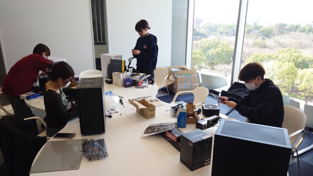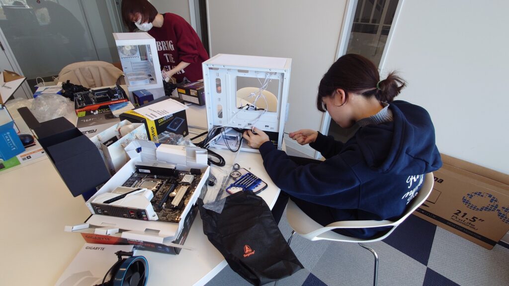 2月17日(火)、商学部2年生の緒方さん、鬼木さん、齋藤さん、福井さんの4名がパソコンの組み立てに挑戦しました。