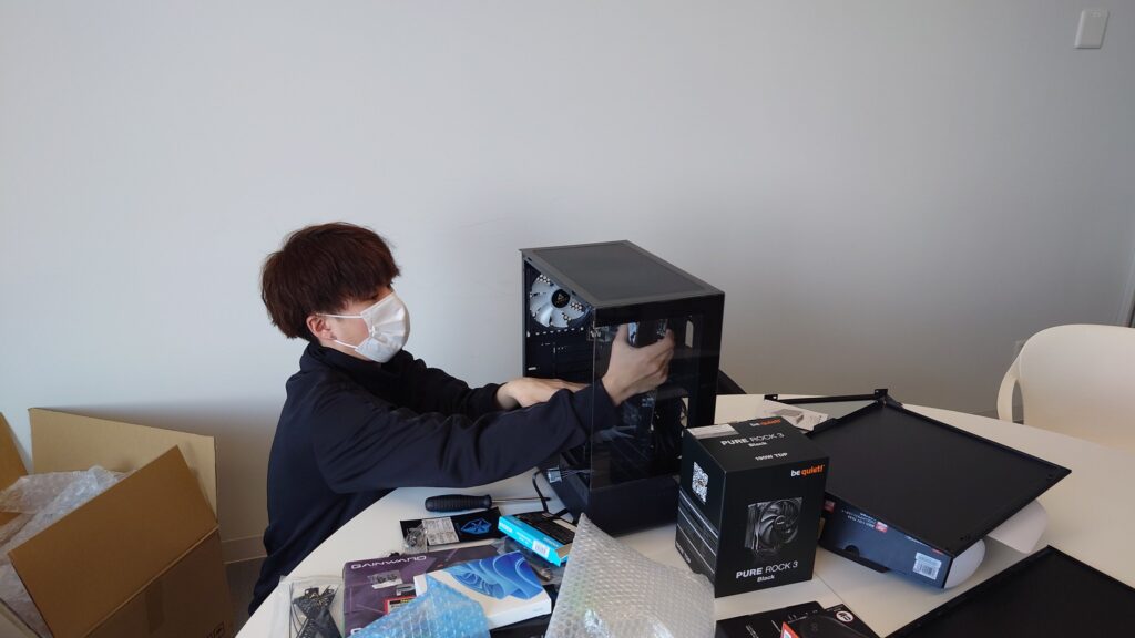 当日は、パーツの確認後、マザーボードへのCPUやメモリ、SSDの取り付け、ケースへの固定、各種コネクタの接続を進めました。その後、マウスやキーボード、モニタなどの周辺機器を接続し、動作確認とWindowsのインストールまで行いました。